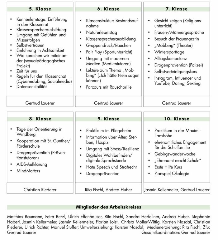 An der Schule existiert ein Arbeitskreis „Selbst- und Sozialkompetenz“, der sich regelmäßig trifft, für die Umsetzung des schuleigenen Lehrplans zur Vermittlung von Selbst- und Sozialkompetenz sorgt, Inhalte reflektiert und den Lehrplan weiterentwickelt. Alle Schüler durchlaufen diese Ausbildung und erhalten am Ende der 10. Klasse ein Zertifikat.