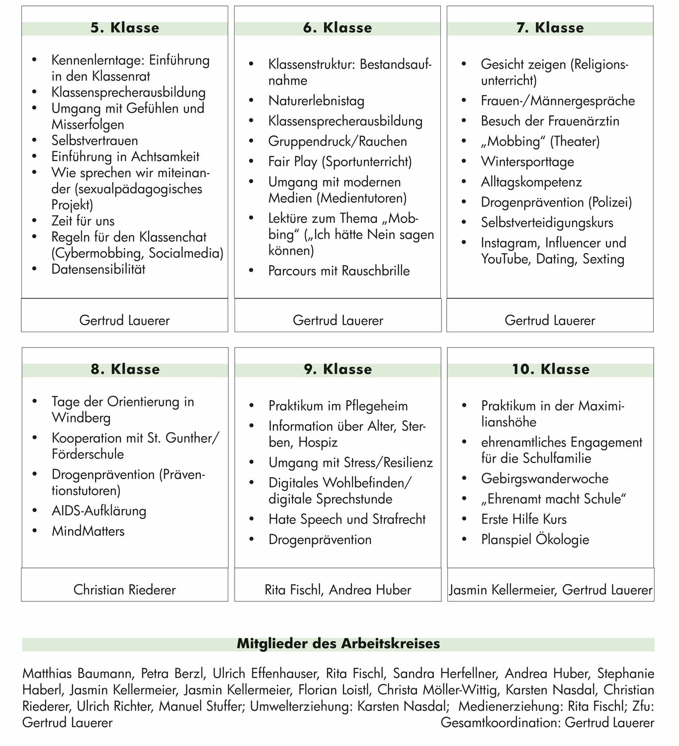 Gestaltung des Schulklimas durch respektvollen Umgang miteinander (Klassenrat, Zeit für uns), Vermittlung von Konfliktlösungsstrategien, Verantwortung füreinander (Tutoren, Schulsanitäter, Streitschlichter, Präventionstutoren, Hausaufgabenbetreuung ...)