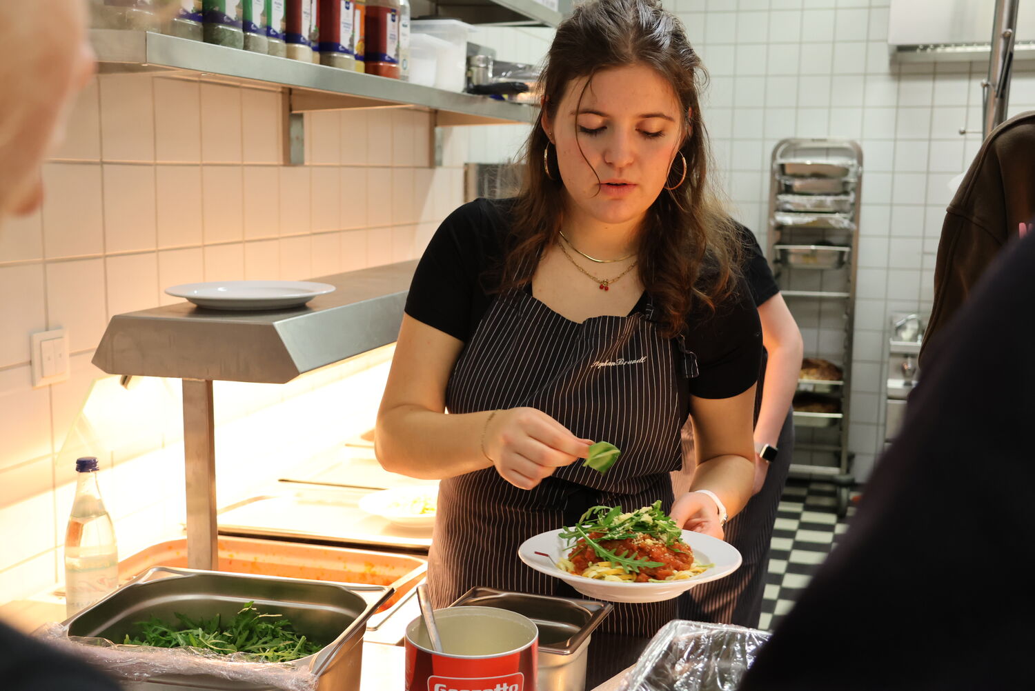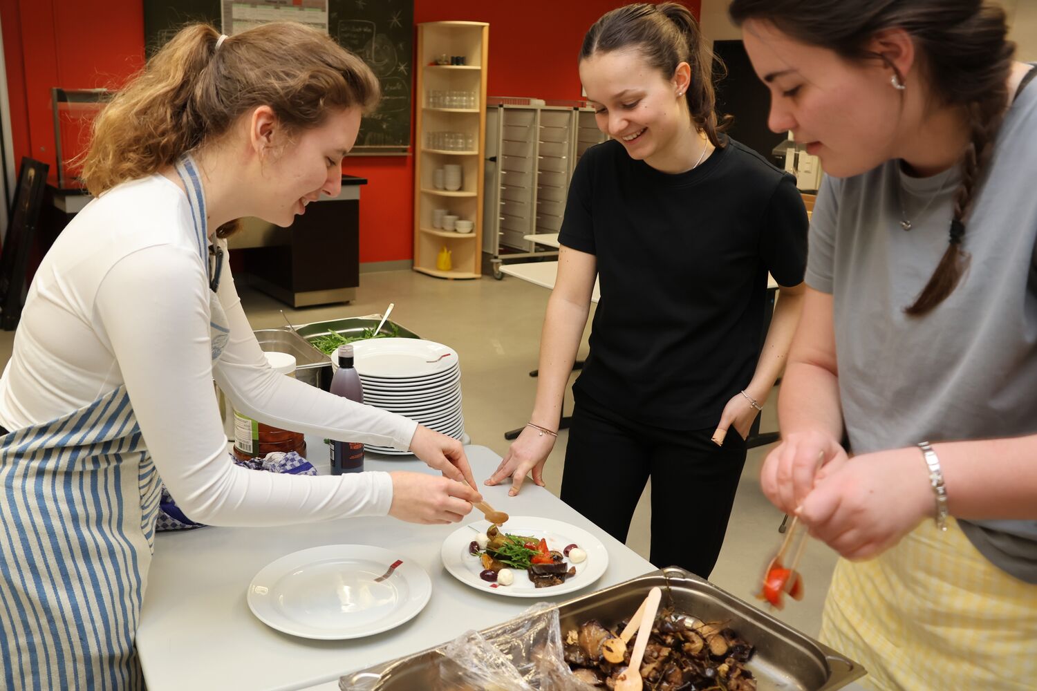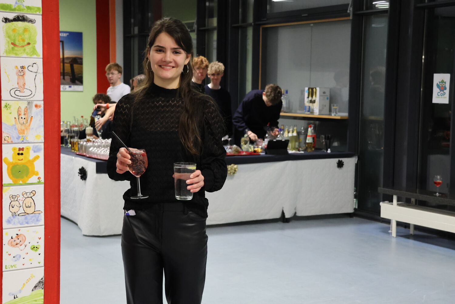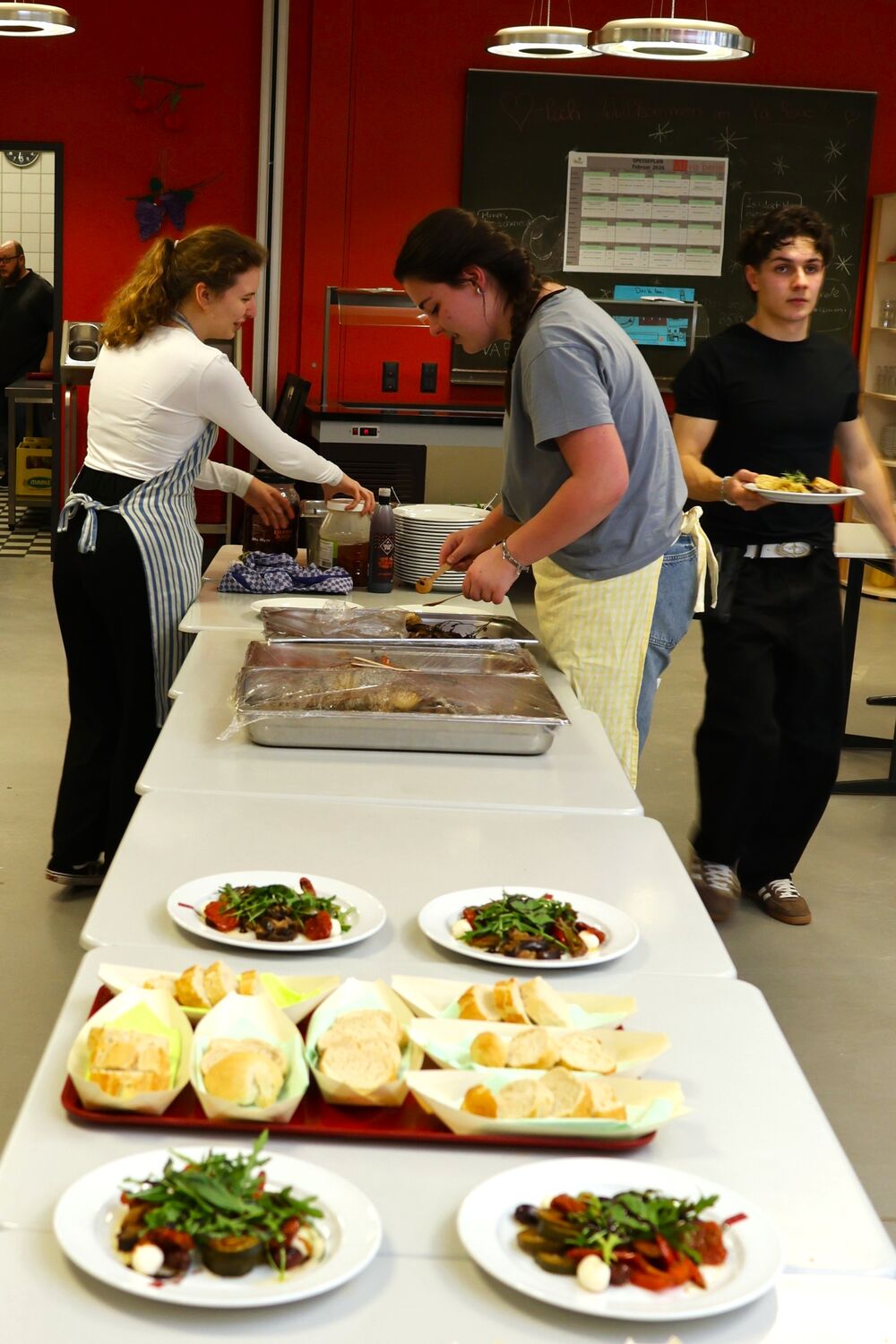 Parallel zur Bühnenkunst entstand hinter den Kulissen eine eigene kulinarische Inszenierung: Mit dankenswerter und professioneller Unterstützung des va bene Teams um Manuel und Jennifer Mühlbauer kreierten die Schüler ein Dreigängemenü, das sowohl optisch als auch geschmacklich eine Schau war. Köstlichkeiten wie Kürbissüppchen, Antipasti, Schweinbraten, Tagliatelle und Schokoküchlein, umschmeichelt von einem verführerischen Beerenspiegel, wurden in langen Laufwegen von der va bene Küche bis in die Aula versiert und mit bemerkenswerter Gelassenheit von den „Serviceschülern“ angetragen. Der Ausschank sorgte für klassische Getränke und kreative Virgin Cocktails. Im Hintergrund war mit den Bühnentechnikern noch ein weiteres Oberstufenteam tätig, das einen ebenso wesentlichen Anteil am reibungslosen Ablauf des Abends hatte.