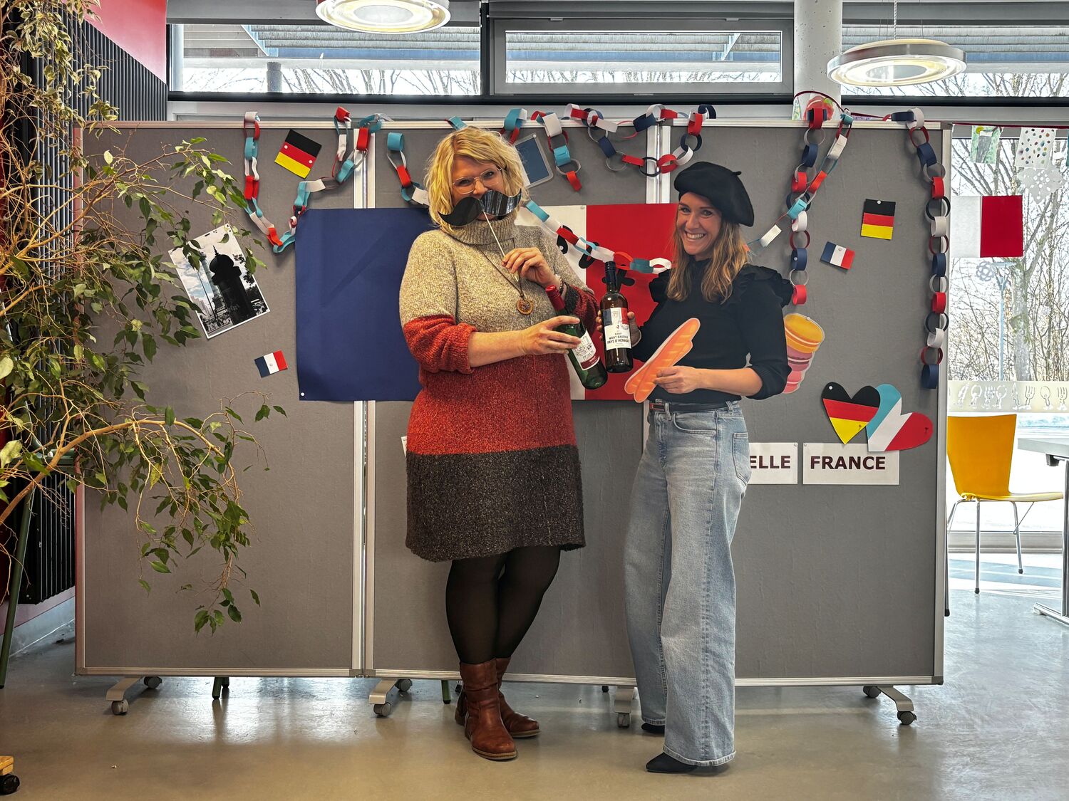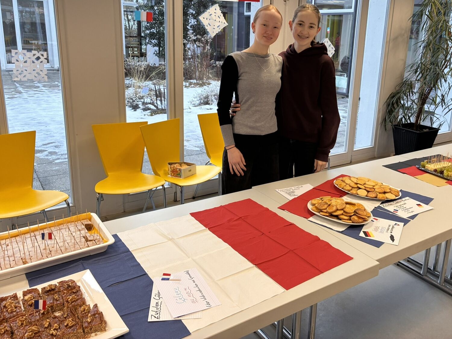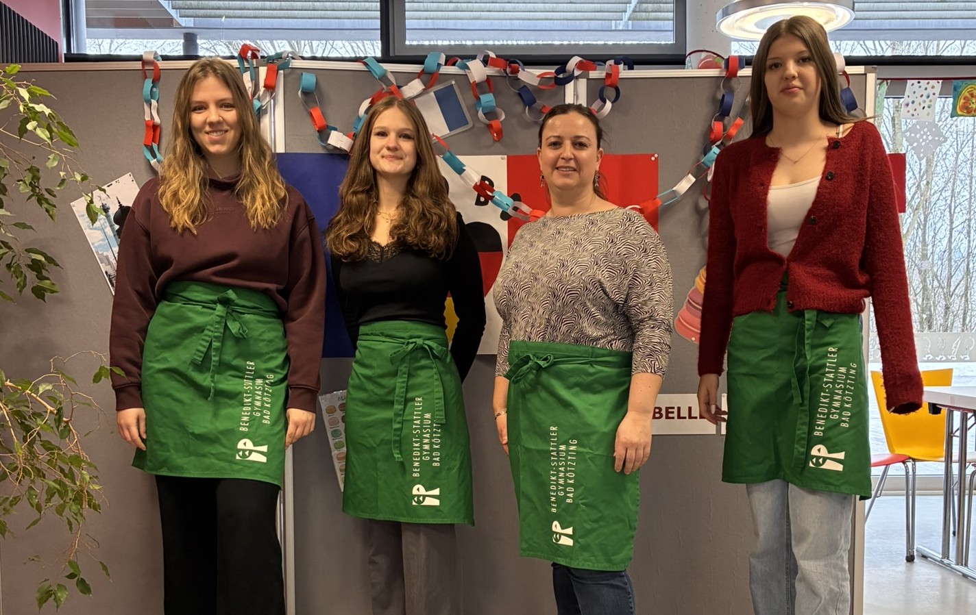 Am 22. Januar beging das BSG gemeinsam den deutsch-französische Tag gefeiert. Die Französischschüler der 10. Jahrgangsstufe hatten fleißig selbst gebacken und für die ganze Schulfamilie ein deutsch-französisches Buffet für die Pausen vorbereitet. Angeboten wurden unter anderem selbst gebackene Sablés bretons, ein typischer französischer Walnusskuchen nach einem Rezept aus Grenoble, sowie der aus dem Schulbuch bekannte, alkoholfreie giftgrüne Cocktail Diabolo Menthe. Natürlich durften auch Klassiker wie Brez'n, Obazda und Baguette nicht fehlen. Auch die Speisekarte des va bene stand in dieser Woche mit Crêpes und Flammkuchendonut ganz unter dem deutsch-französischen Motto.