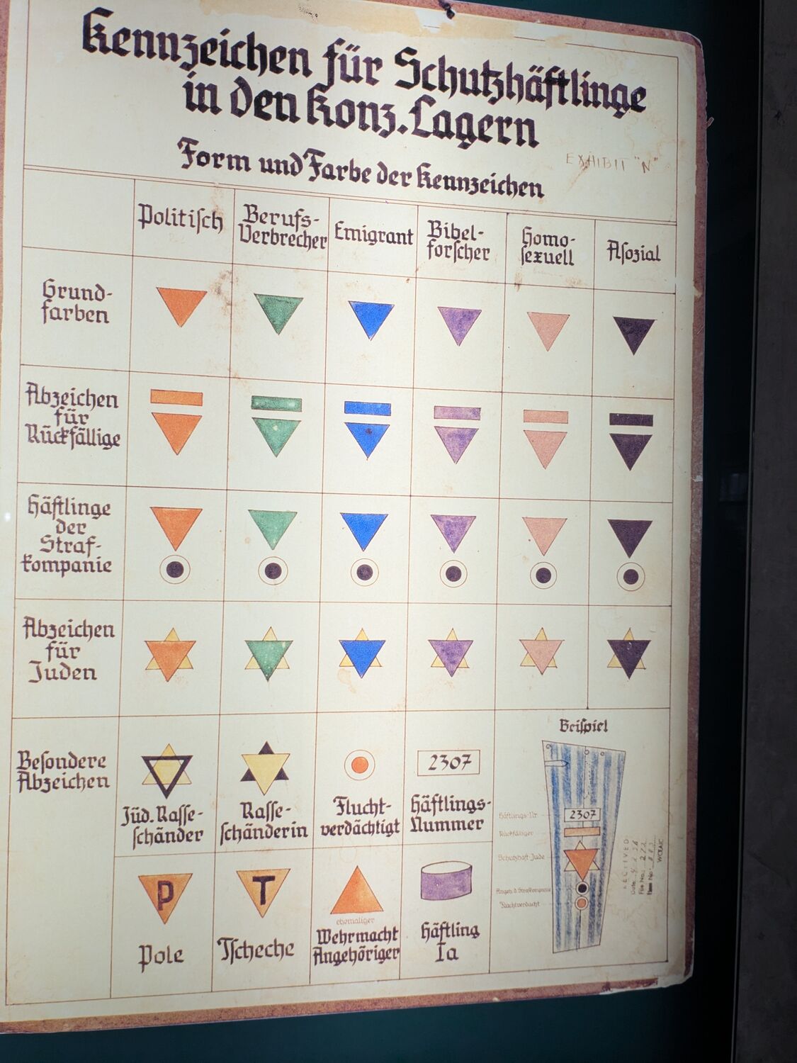 Auf Schautafeln und Ausstellungsobjekten wird versucht, die Einzelschicksale der Opfer zu vergegenwärtigen. Zudem erfährt man vom perfiden Kontroll- und Bürokratisierungswahn der Nazis. In den Lagern wurden die Inhaftierten mit Nummern, verschiedenfarbigen "Winkeln" und weiteren Aufnähern auf der Kleidung in Kategorien eingeteilt. Namen gab es nicht mehr.