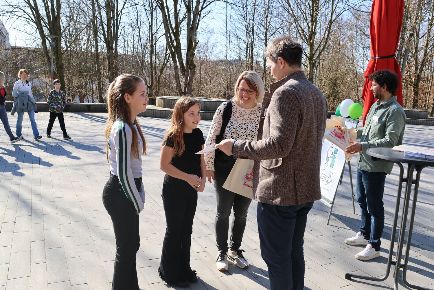 Vor den weit geöffneten Türen wurden bei herrlichstem Frühlingssonnenschein die Familien bereits mit einer BSG-Tragetasche, in der die wichtigsten Infomaterialien über die Anmeldung und das Bad Kötztinger Gymnasium verstaut waren, ausgestattet. Der Inhalt konnte aber getrost erst zu Hause in Augenschein genommen werden, denn jetzt hieß es erst mal, das BSG aktiv zu erleben und offene Fragen im persönlichen Austausch mit älteren Schülern, Lehrern, Schulleitung und Elternbeirat zu klären.